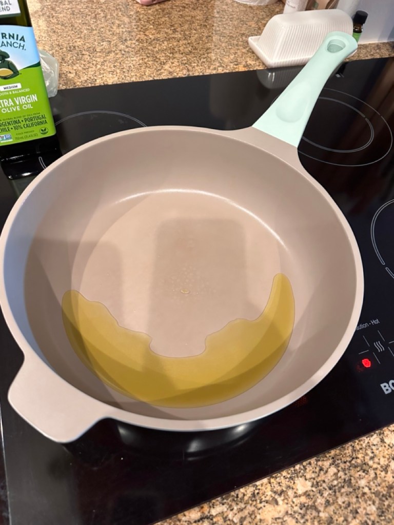 1. Pour the olive oil into a large skillet. Heat the pan over medium-high heat.