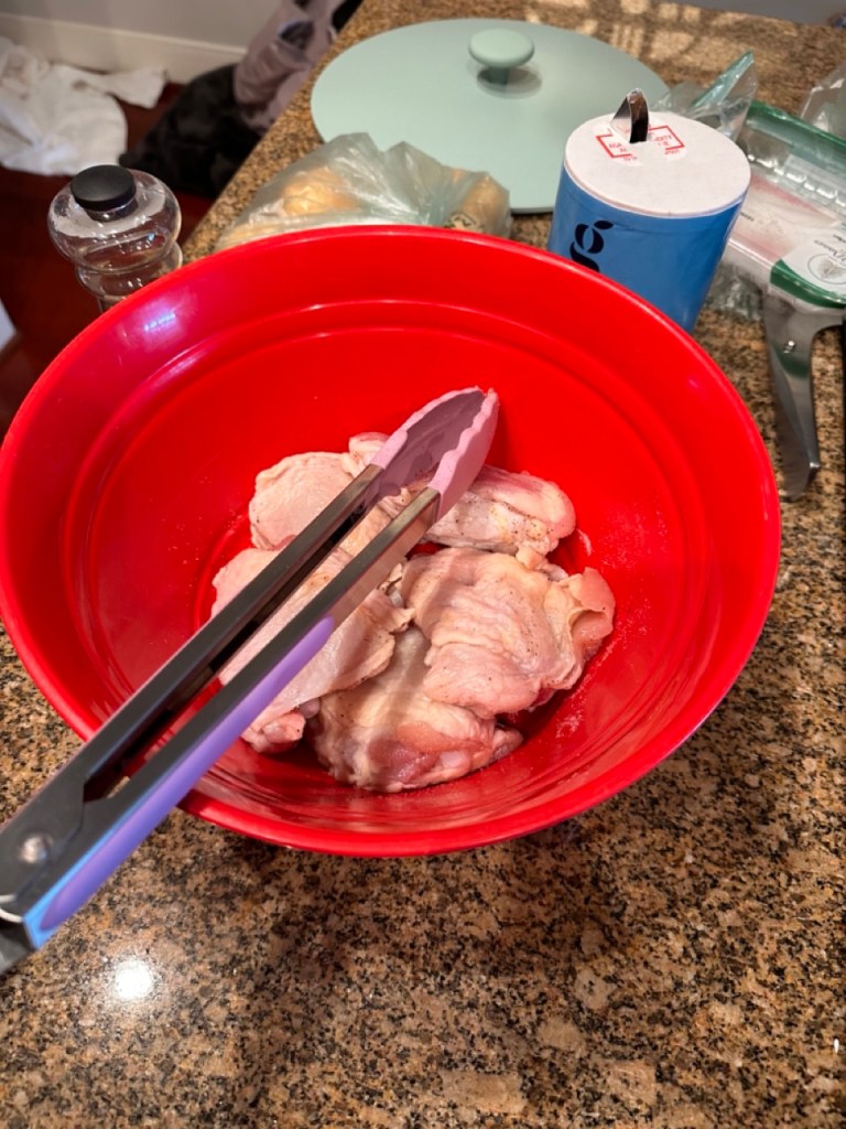 After an overstimulating weekend (hello introversion, thanks for continuing to be a part of my life), I needed a quick and comforting meal. I also needed to use the chicken thighs and potatoes that I bought several days ago. Food waste has no place in this basic ass kitchen! Here’s what I made for dinner yesterday.