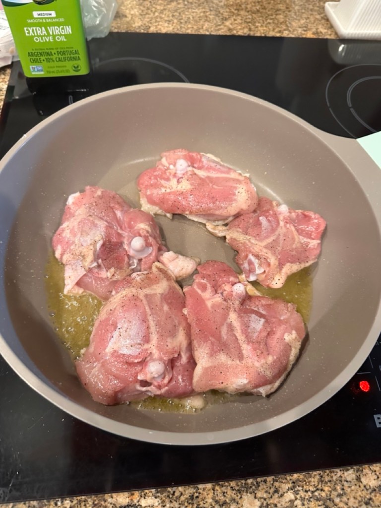 3. Place the chicken thighs in the hot oil, skin side down.